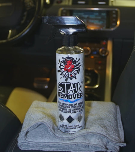 GarageBulls® Stain Remover; is an ultra-powerful stain remover that penetrates deeply and dissolves tough stains, then emulsifies on the surface to restore leather, plastic, fabric, upholstery and carpets.